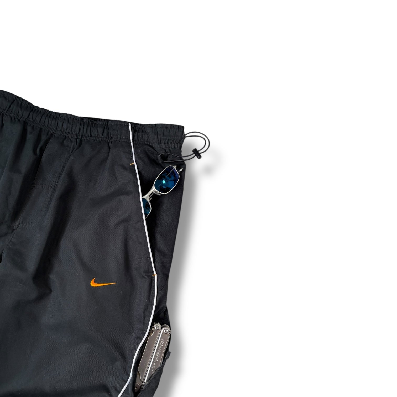 Black colourway, featuring curved white piping along both legs for a dynamic silhouette. Constructed from a lightweight fabric, include an elasticated waistband with adjustable drawcord, and two angled side pockets. One leg sports a functional zip cargo pocket, while the back includes a single zip pocket. Shox logos are seen throughout, including a small orange swoosh on the front and bold reflective lettering on the lower leg. Cinch cords at the hems allow for a customizable fit.