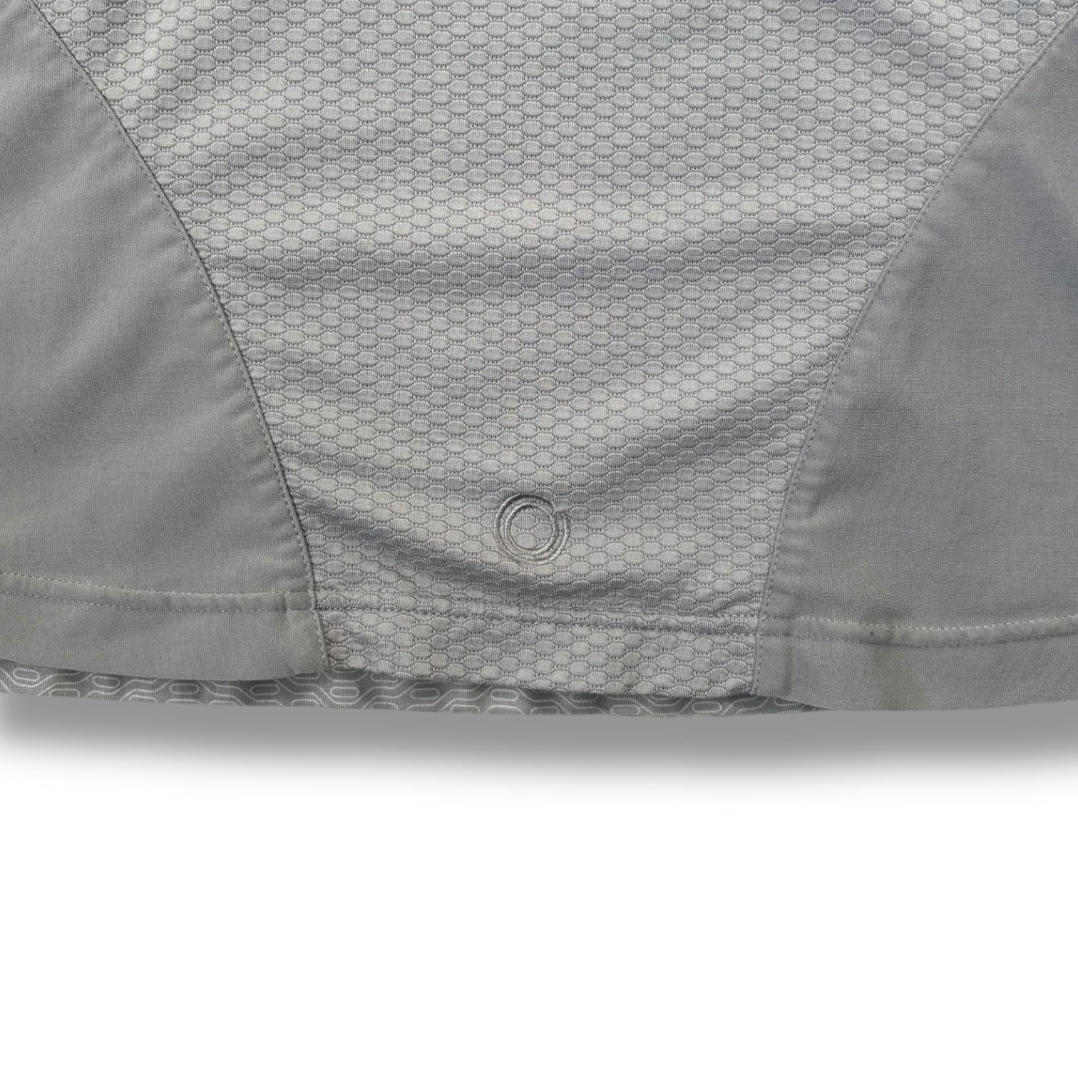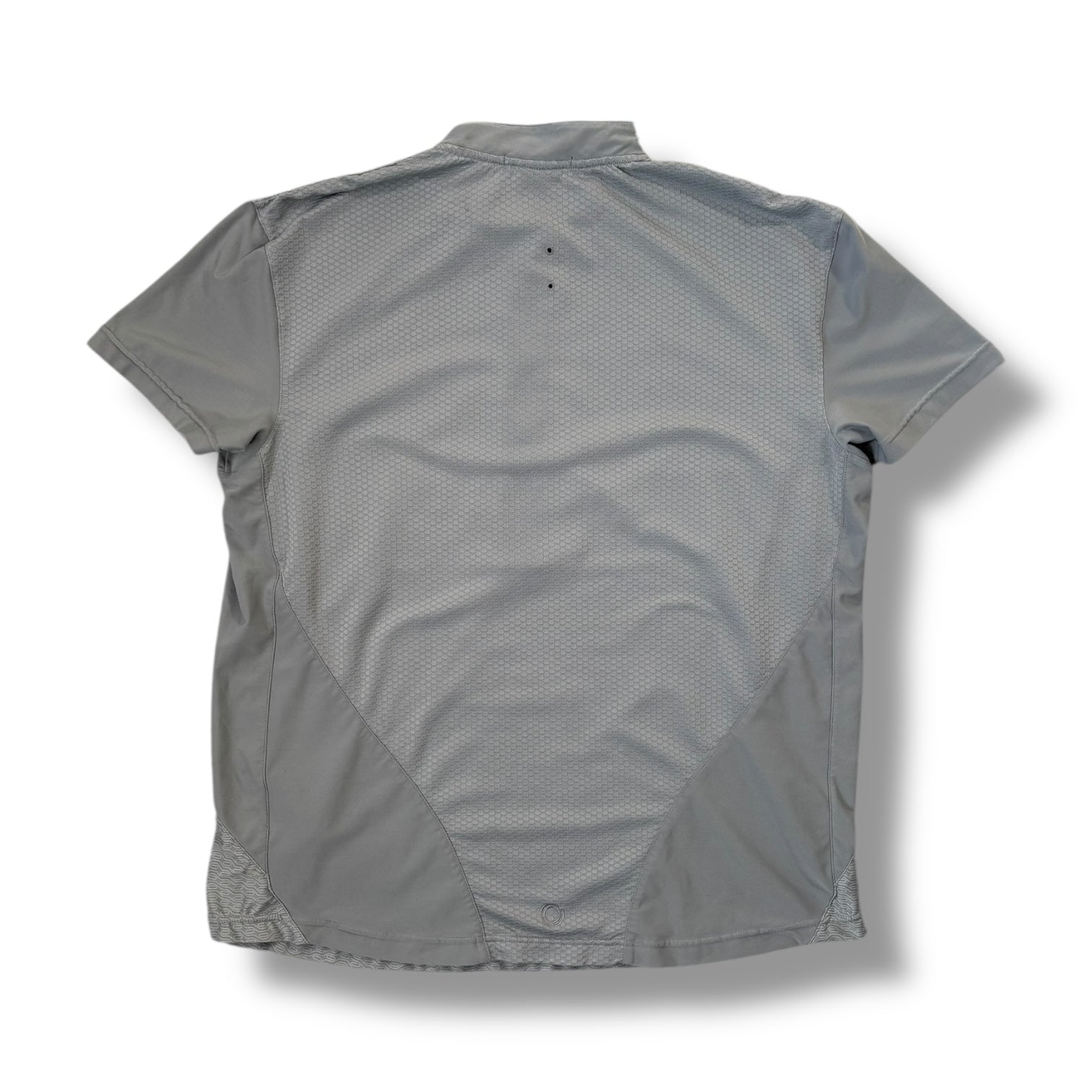 Light grey colourway with subtly patterned front and rear mesh panels that provide a lightweight, breathable structure. The front features a bold black half-zip closure extending down from a mock neck collar. Side panels are finished in a solid tonal grey, small ventilation eyelets on the upper back further enhance airflow. The hem is slightly curved.