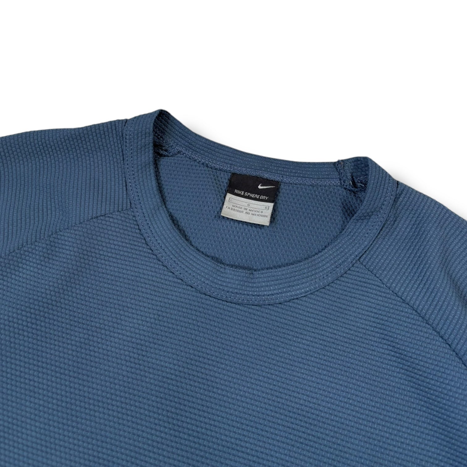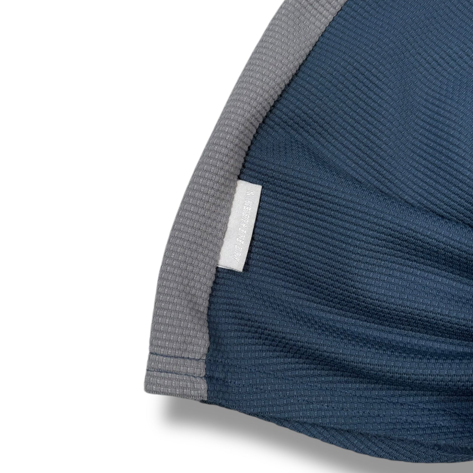 Blue colourway, light weight therma fit material, almost waffle like. Panelling down each side of the tee.