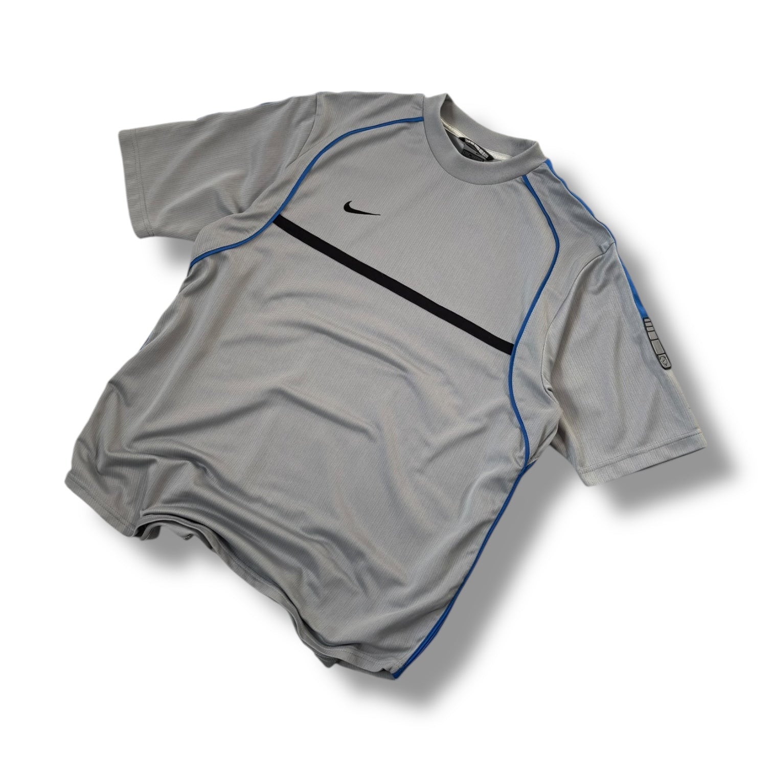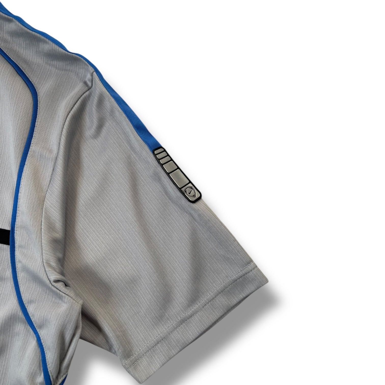 Grey colourway with vibrant royal blue piping and black detailing across the chest. The construction features a ribbed texture throughout the body, and the sleeves are accented with a bold blue stripe running from the collar to the sleeve hem.