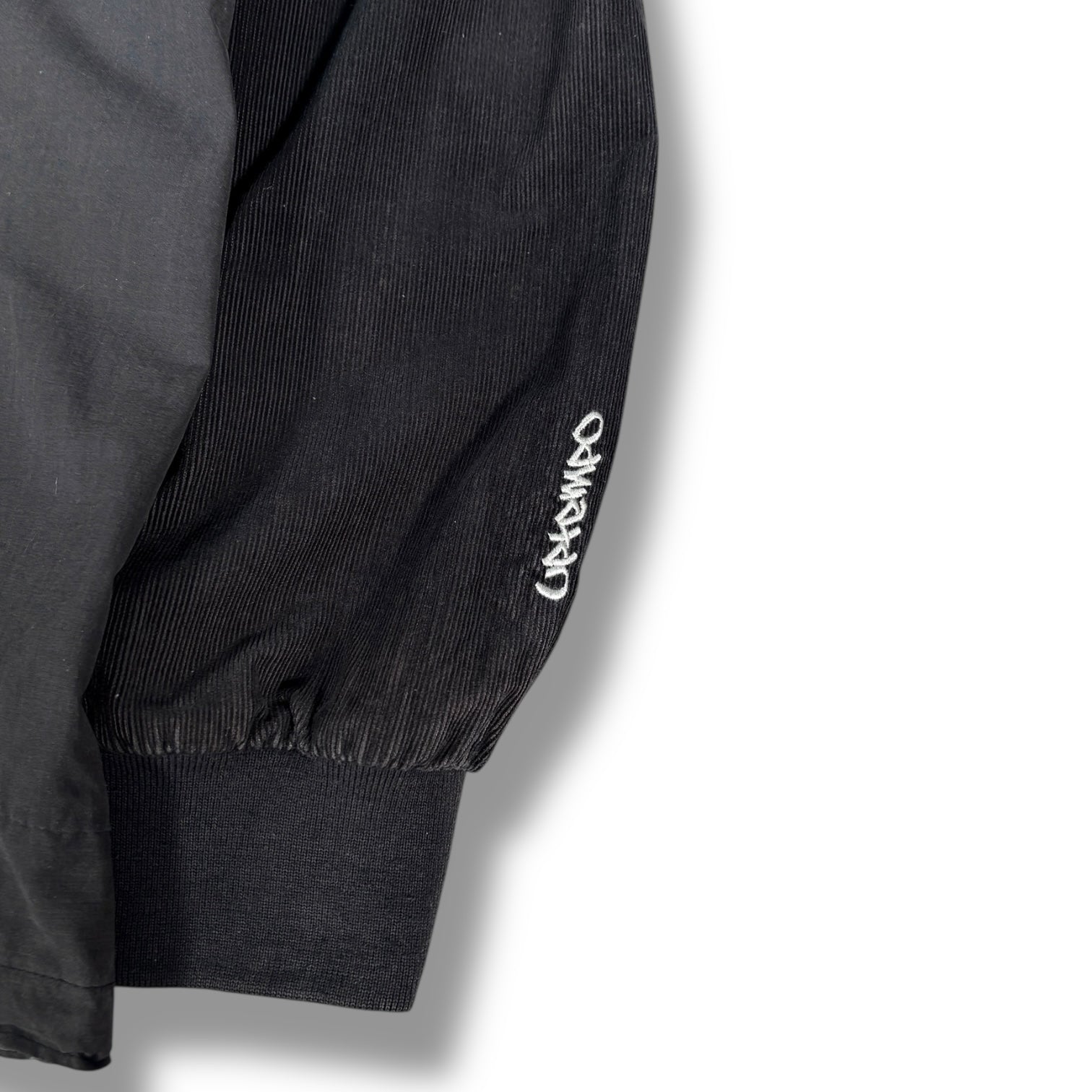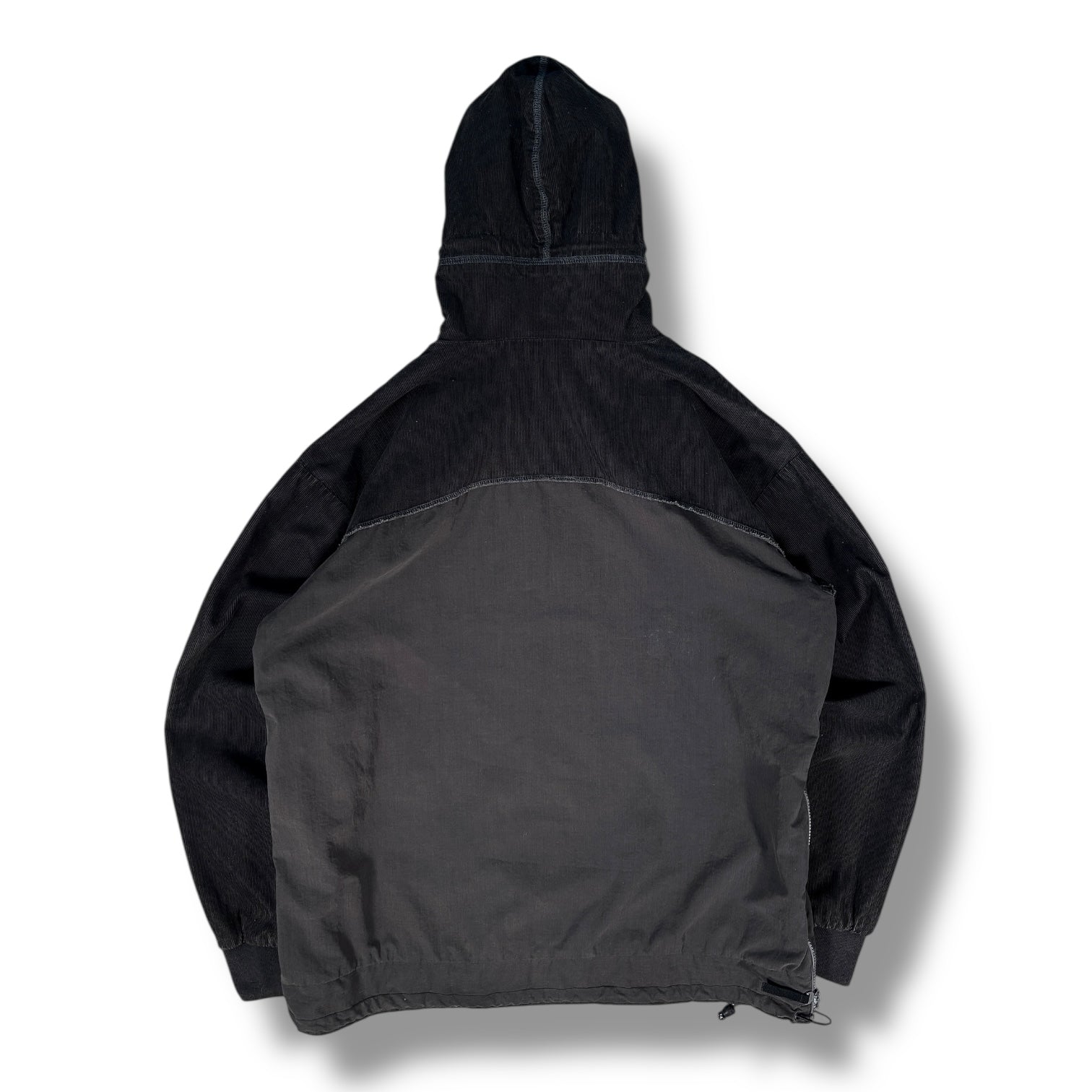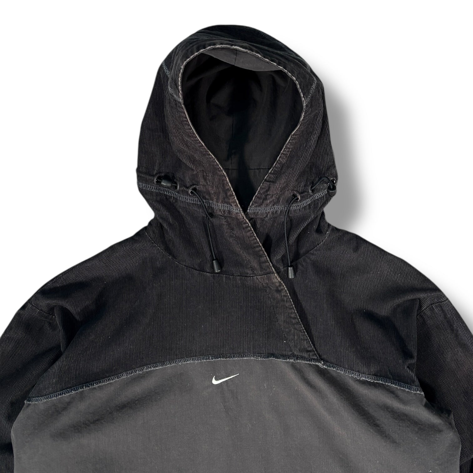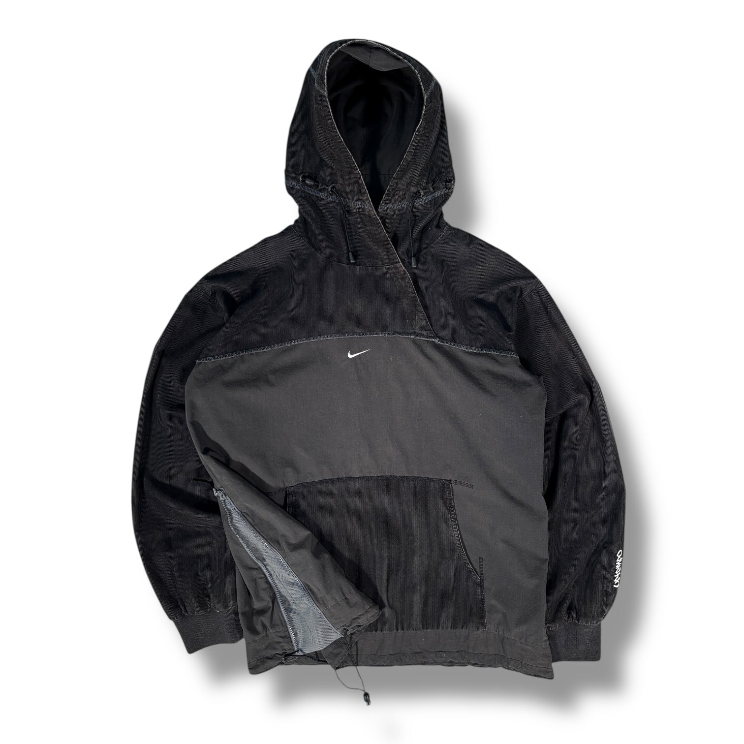 Black colourway featuring a paneled construction with a blend of corduroy and canvas textures. Includes a kangaroo pocket, a hidden side zip, popper button above the chest and a drawstring-adjustable hood. Small swoosh on the chest and embroidered Uptempo logo on the left sleeve.