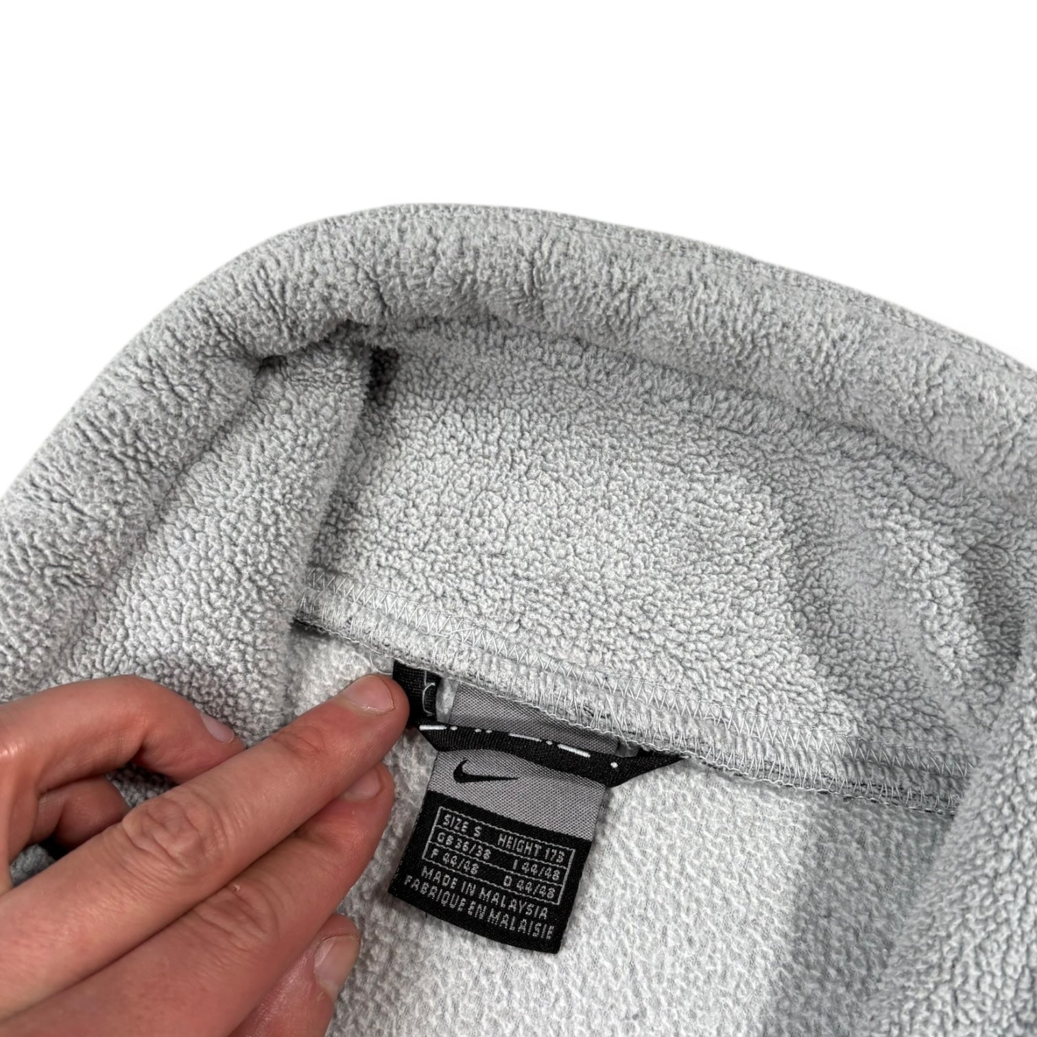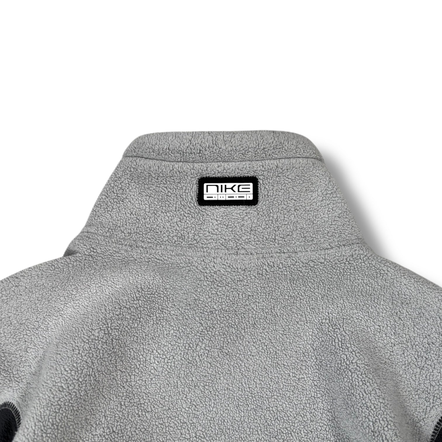 Light grey colourway with a fleece construction. Features a high collar design and tonal dual zip closure. A small Nike morse code patch at the back adding subtle detail. Hidden zip pockets and both hem and cuffs being ribbed.