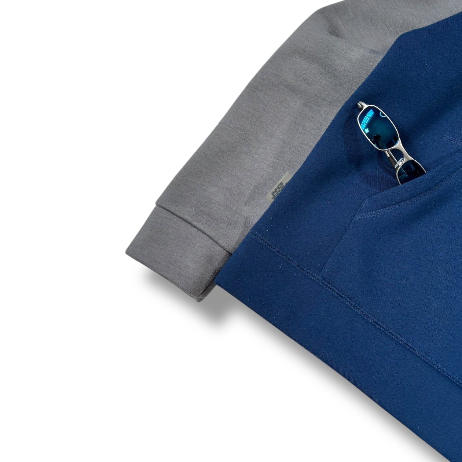 Navy/ Grey colorway, lightweight scuba material. 2 open slit pockets. Front zipper is asymmetrical and dual zipped running along the side. Hood is toggle adjustable.