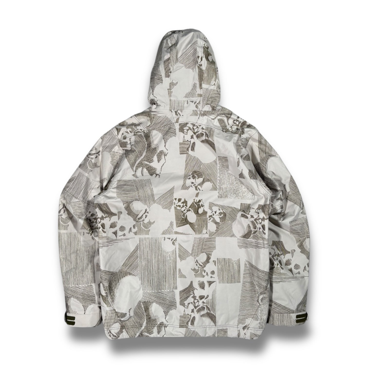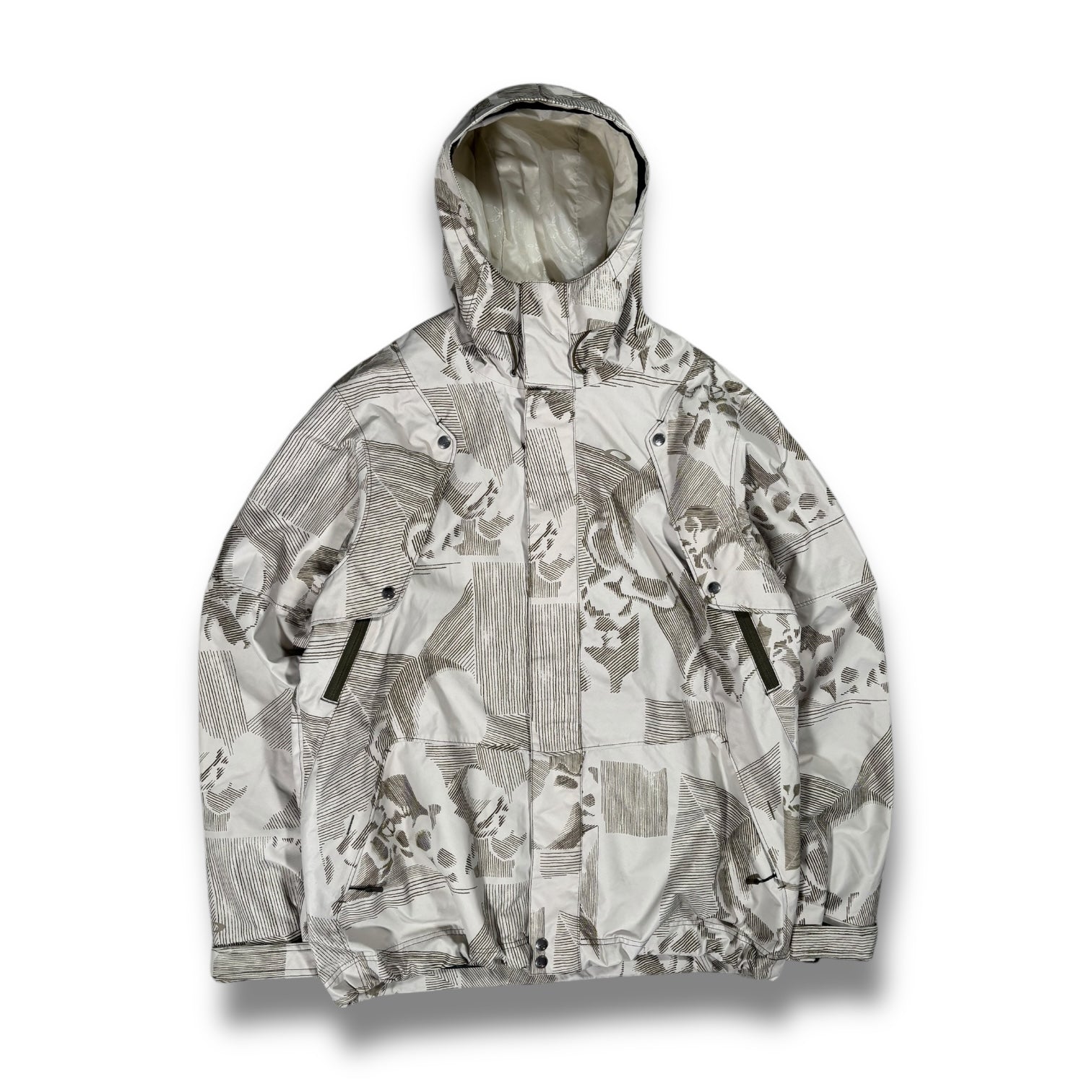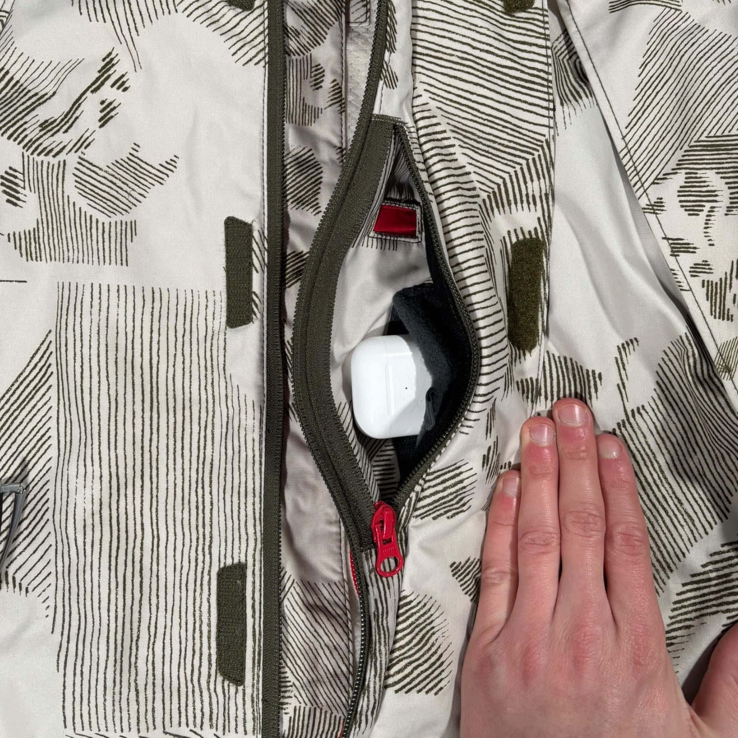 Off white and grey colourway, thermolite insulation, chest vents, powder skirt, internal pockets, cinches, removable hood, and a magnetic fastener on the back of the jacket to keep the hood down in case the wearer chooses to invert themselves. MP3 system in the hidden stash chest pocket.