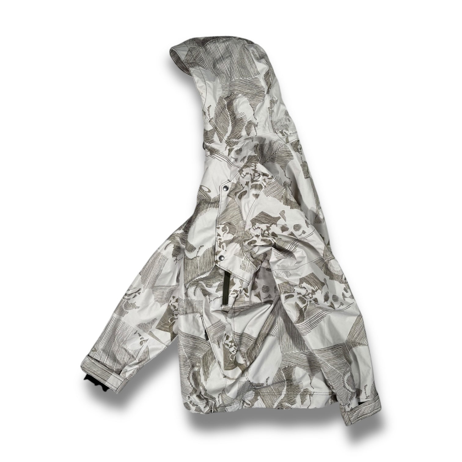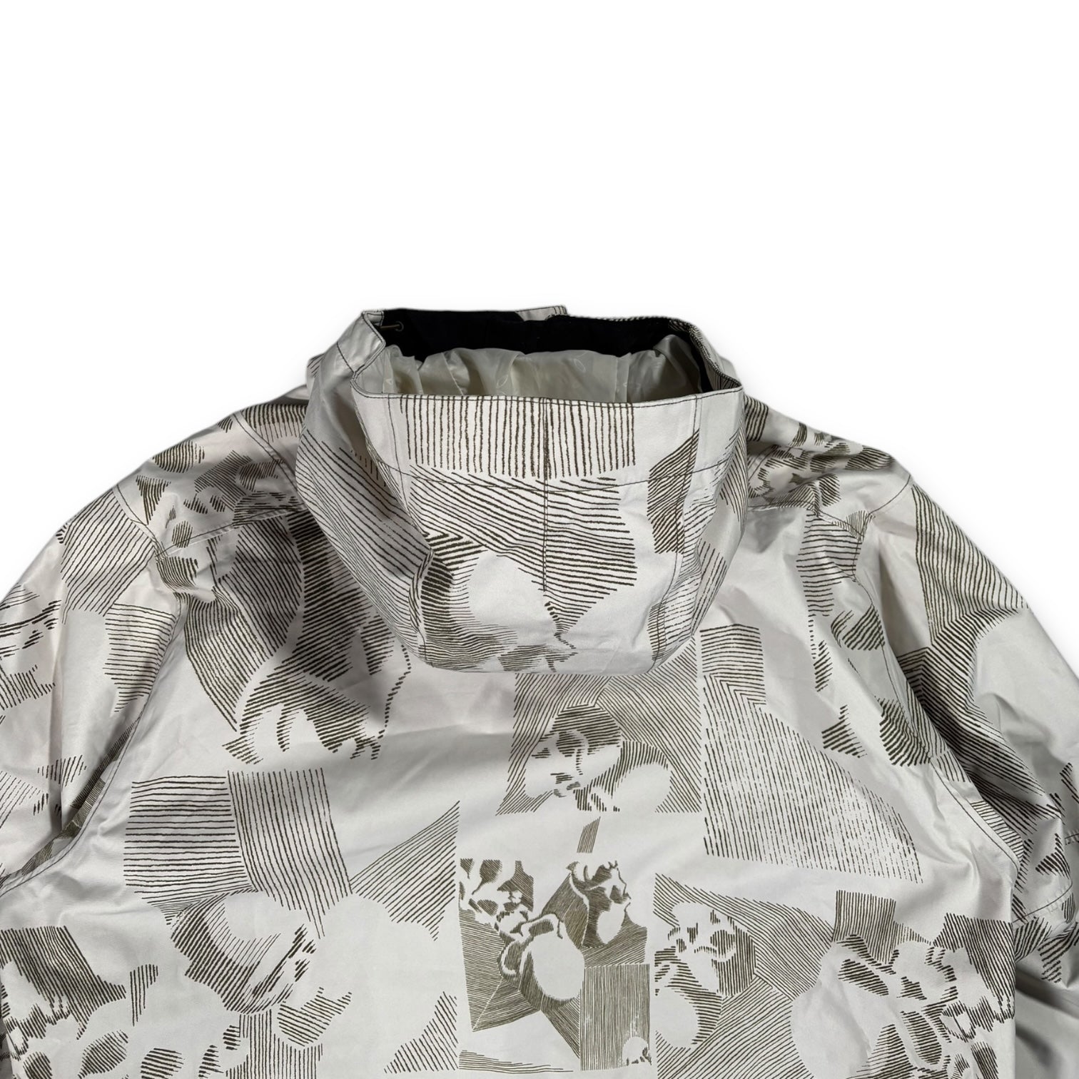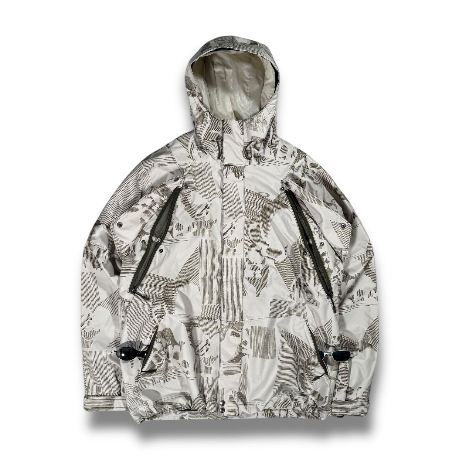 Off white and grey colourway, thermolite insulation, chest vents, powder skirt, internal pockets, cinches, removable hood, and a magnetic fastener on the back of the jacket to keep the hood down in case the wearer chooses to invert themselves. MP3 system in the hidden stash chest pocket.
