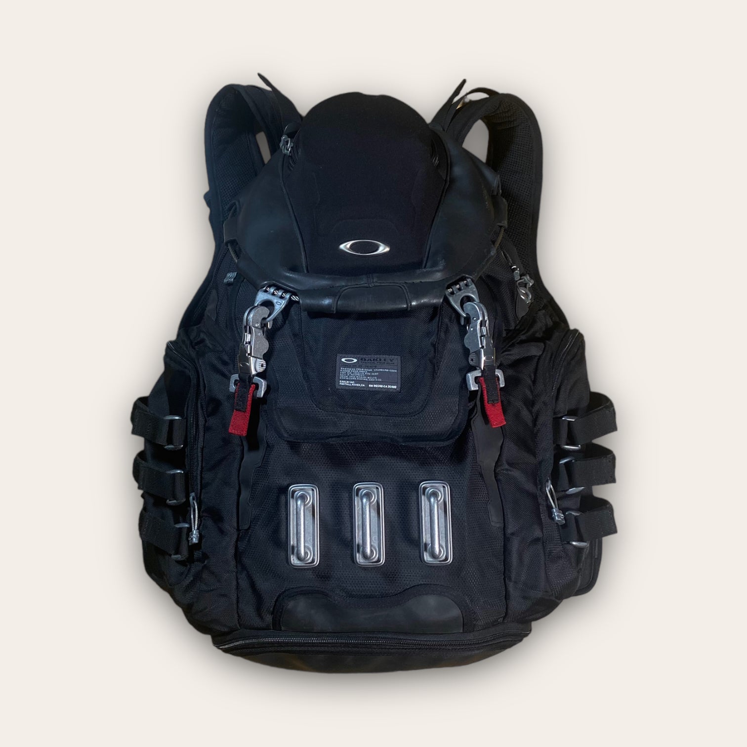 - Features: Metal Strap Buckles With Every Buckle Having An Engraved Oakley Logo, 10 Individual Compartments, Ridiculous Amount Of Space. Adjustable Straps, Waterproof And Highly Durable With A Hard Shell Top.