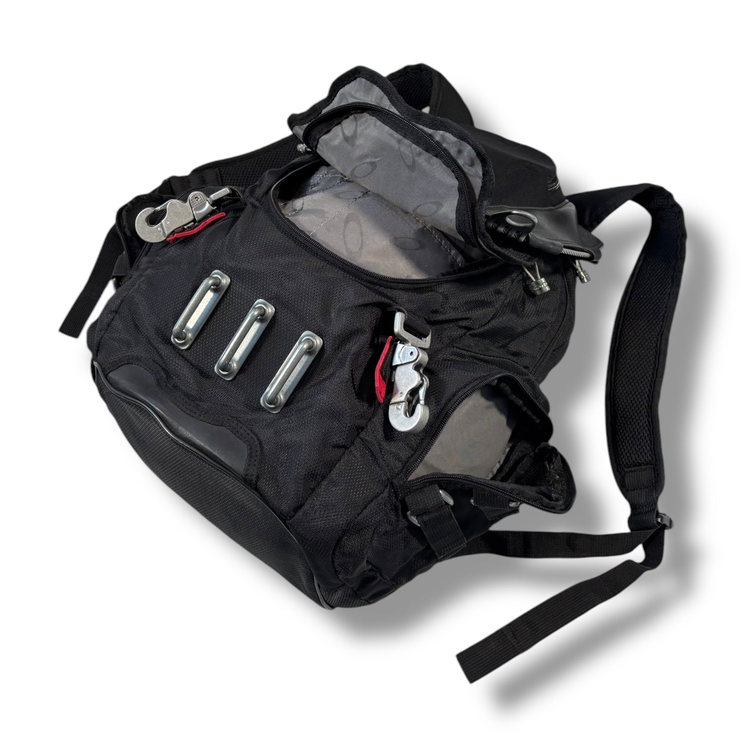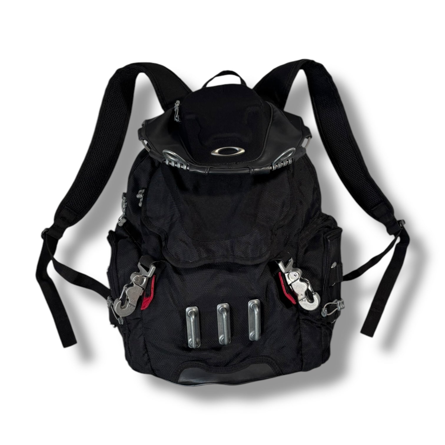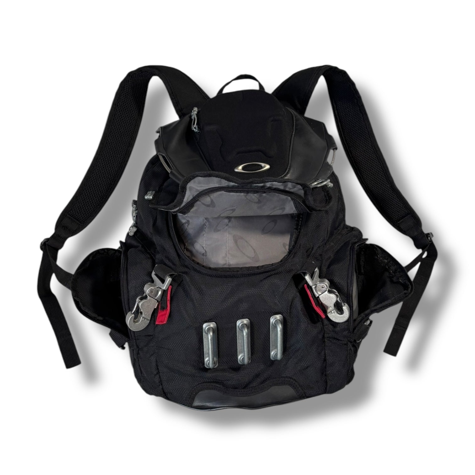 Black colourway, metal strap buckles with every buckle featuring an engraved oakley logo, 10 Individual compartments. Adjustable straps, waterproof and highly durable with a hard shell top.