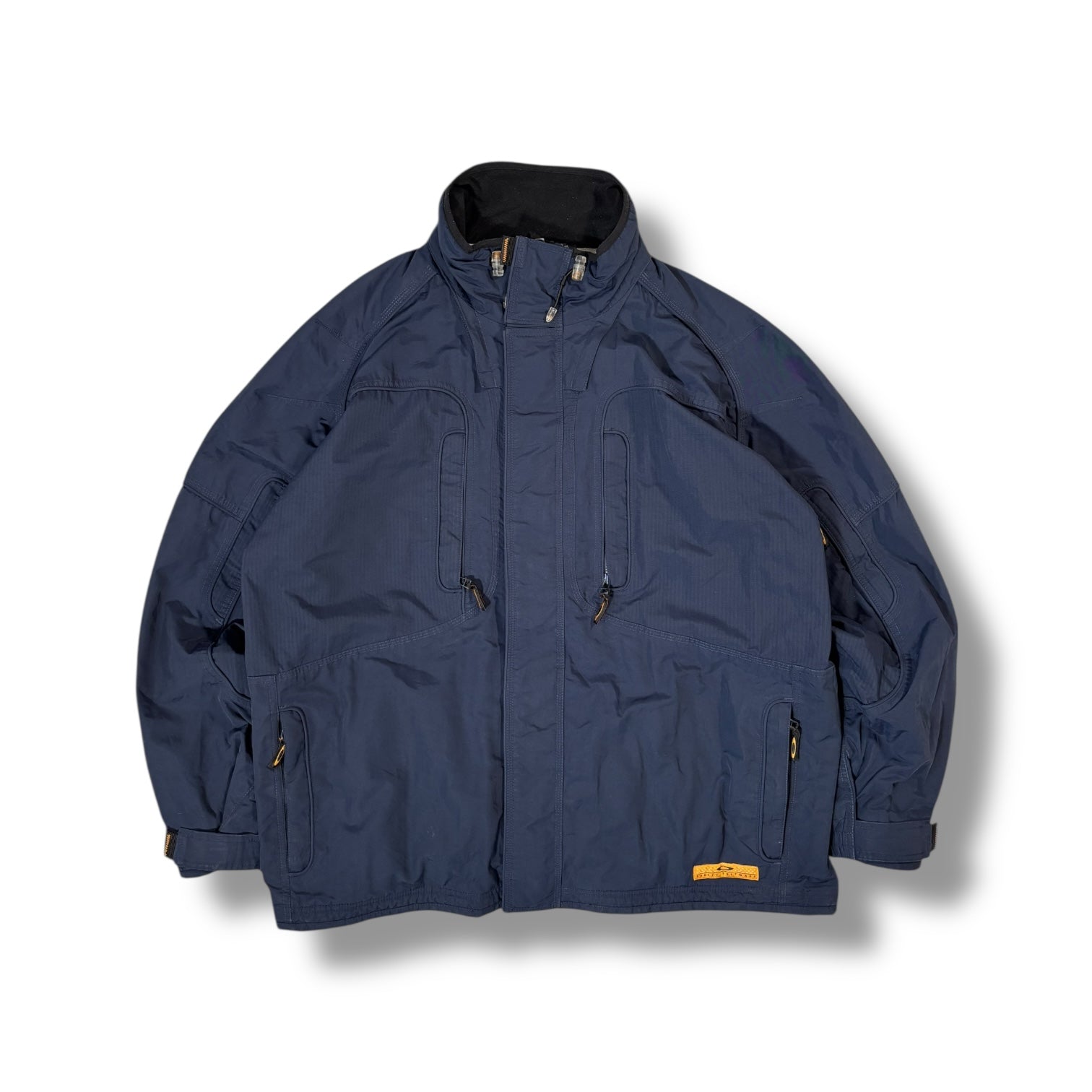 Navy colourway with a high collar and adjustable cuffs, this piece features a durable outer shell with mesh lining for breathability. It has a total of six zippered pockets—two vertically-aligned chest pockets, two lower front pockets with reinforced seams, a discreet zippered arm pocket, and a rear-side utility pocket. Subtle panel stitching and contrasting zipper pulls. The fit is slightly oversized, offering room for layering and mobility.