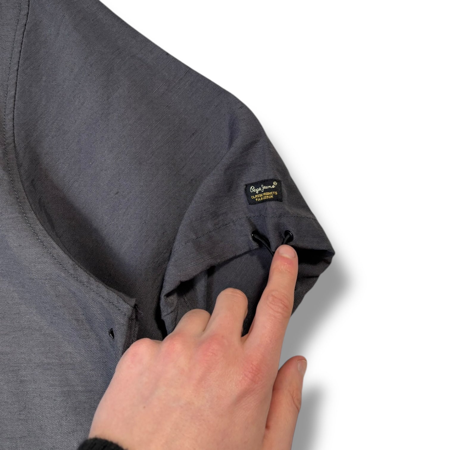 Slate grey colourway, heavyweight material. Contrast seam runs throughout the shirt. Toggle adjustable cuffs on each arm, small holes under the armpits for ventilation. Small Pepe Jeans logo on the left arm.