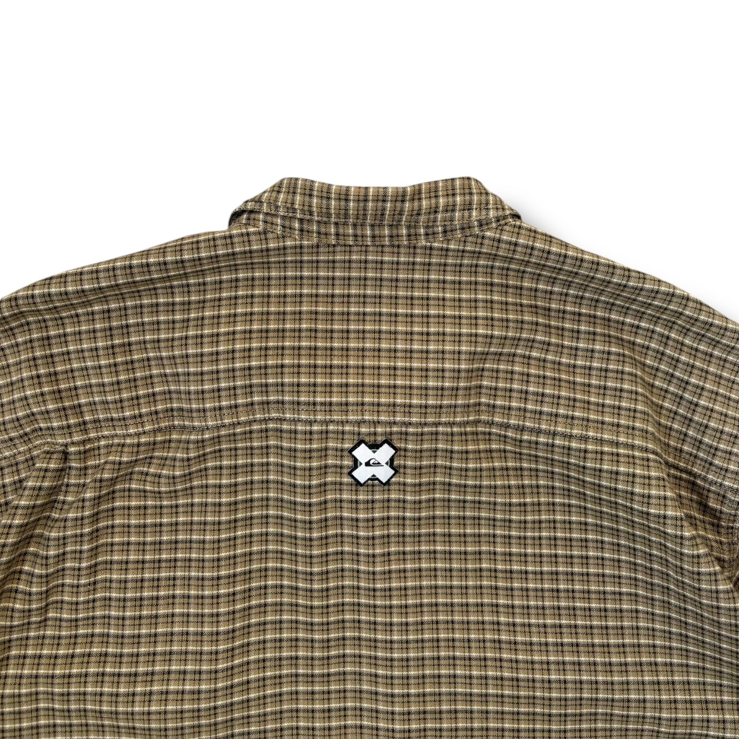 Brown and olive plaid colourway with short sleeves. This piece features a full front button closure with dark buttons and a single Velcro chest pocket on the left side. The back features a Quiksilver X series embroidered logo.