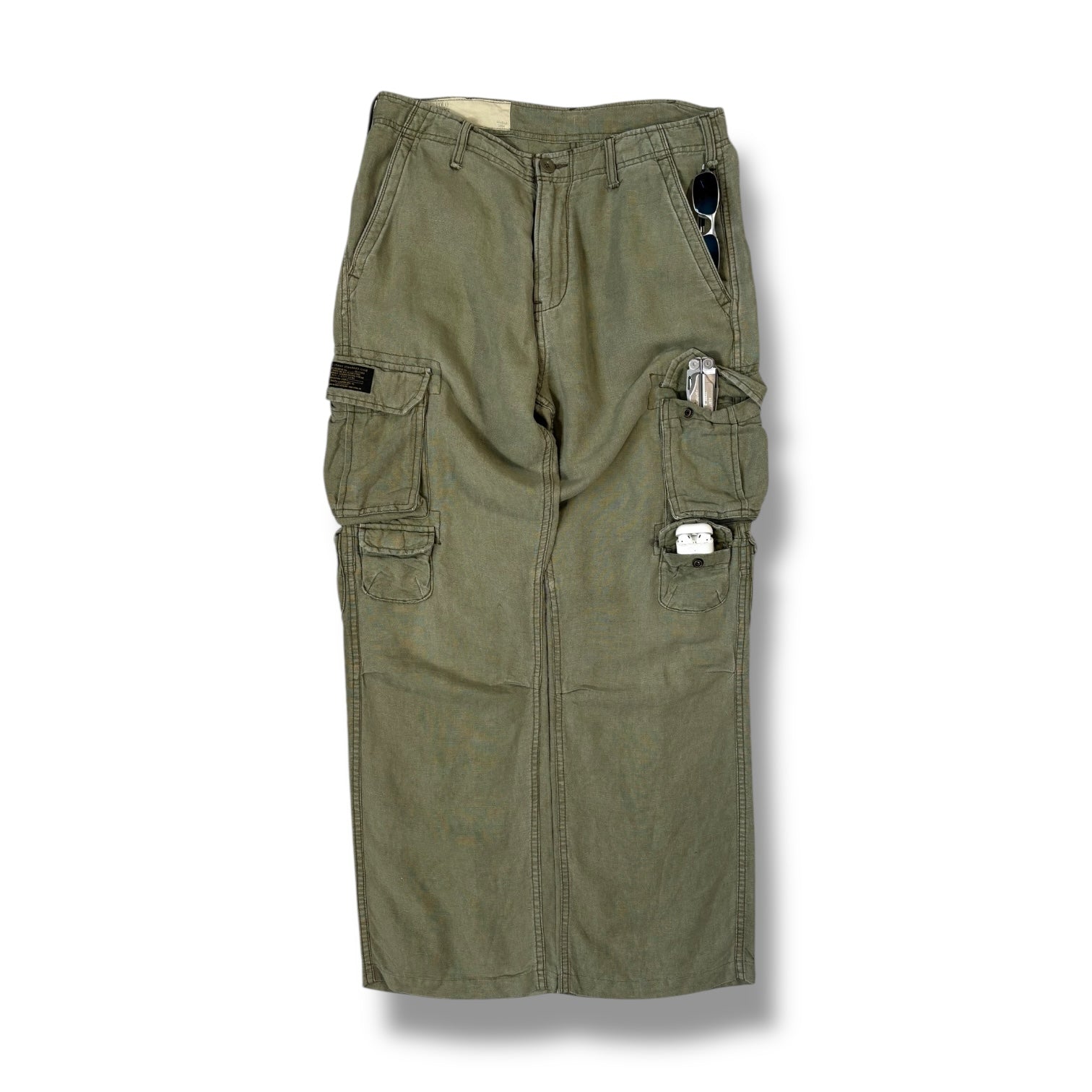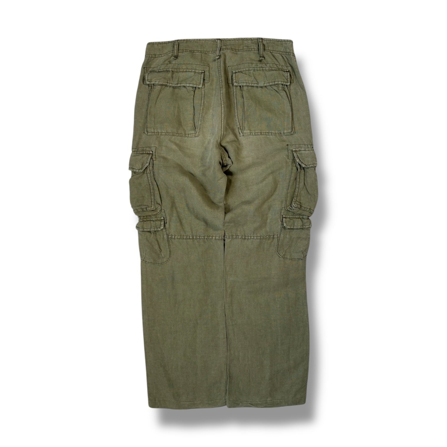 Olive green colourway with multiple cargo pockets on both legs, including flap closures and layered compartments for added storage. The side pockets are deep and angled, providing easy access, while the rear includes dual flap and open patch pockets. Reinforced seams and a slightly faded finish add a worn-in look to the rugged construction.