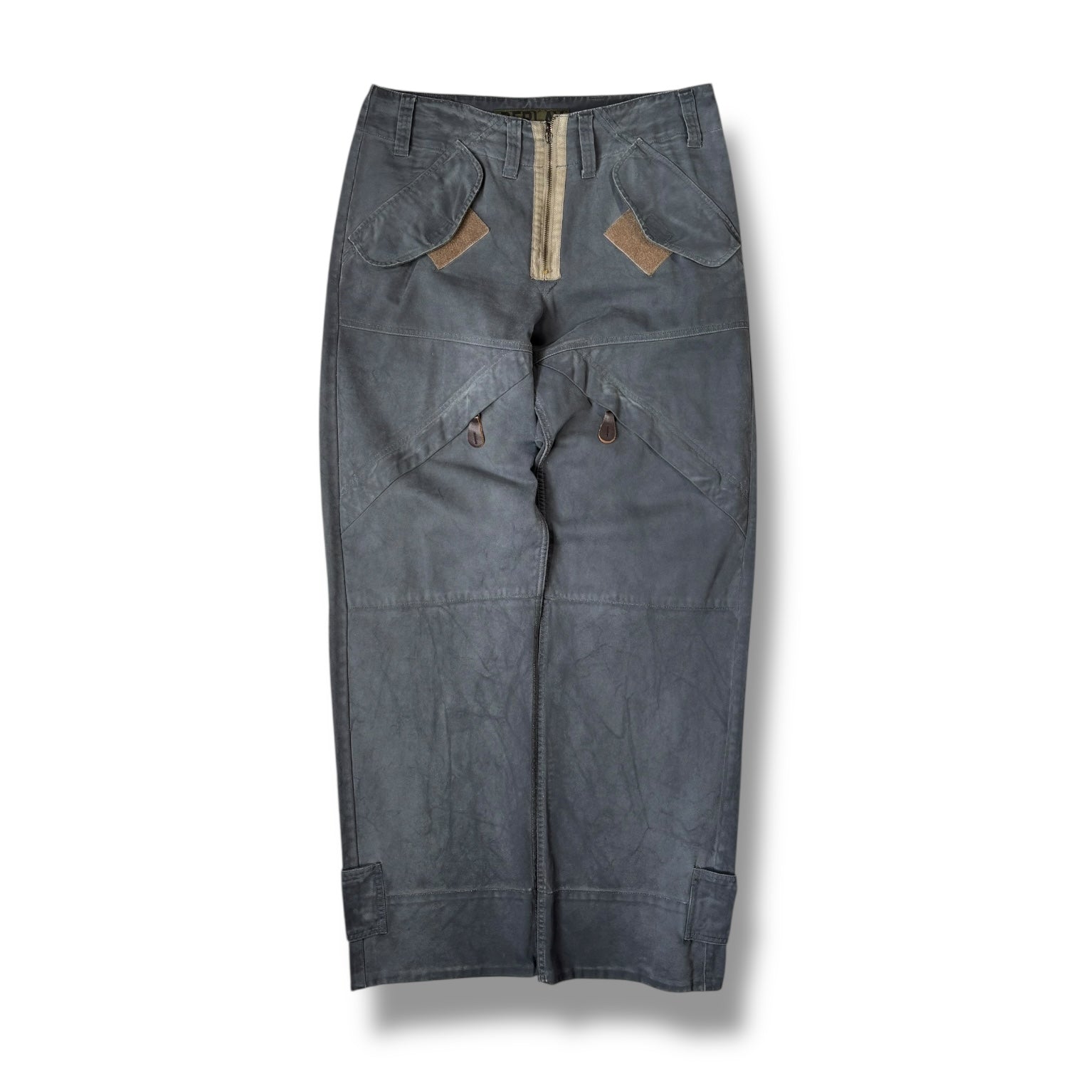 Slate grey colourway featuring a rugged design with a worn-in finish. The front is equipped with asymmetrical zippered pockets angled for easy access, accented by leather pull tabs. Additional flap pockets are positioned at the hips, secured with Velcro patches in a contrasting tan tone. The rear includes flap-secured pockets with the same Velcro detailing, and there’s reinforced paneling throughout for durability. At the hems, adjustable buttoned straps allow for fit customization. Functional details include belt loops and a heavy-duty zipper fly, with various compartments.