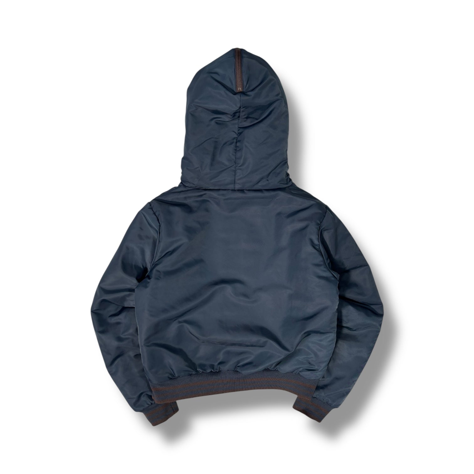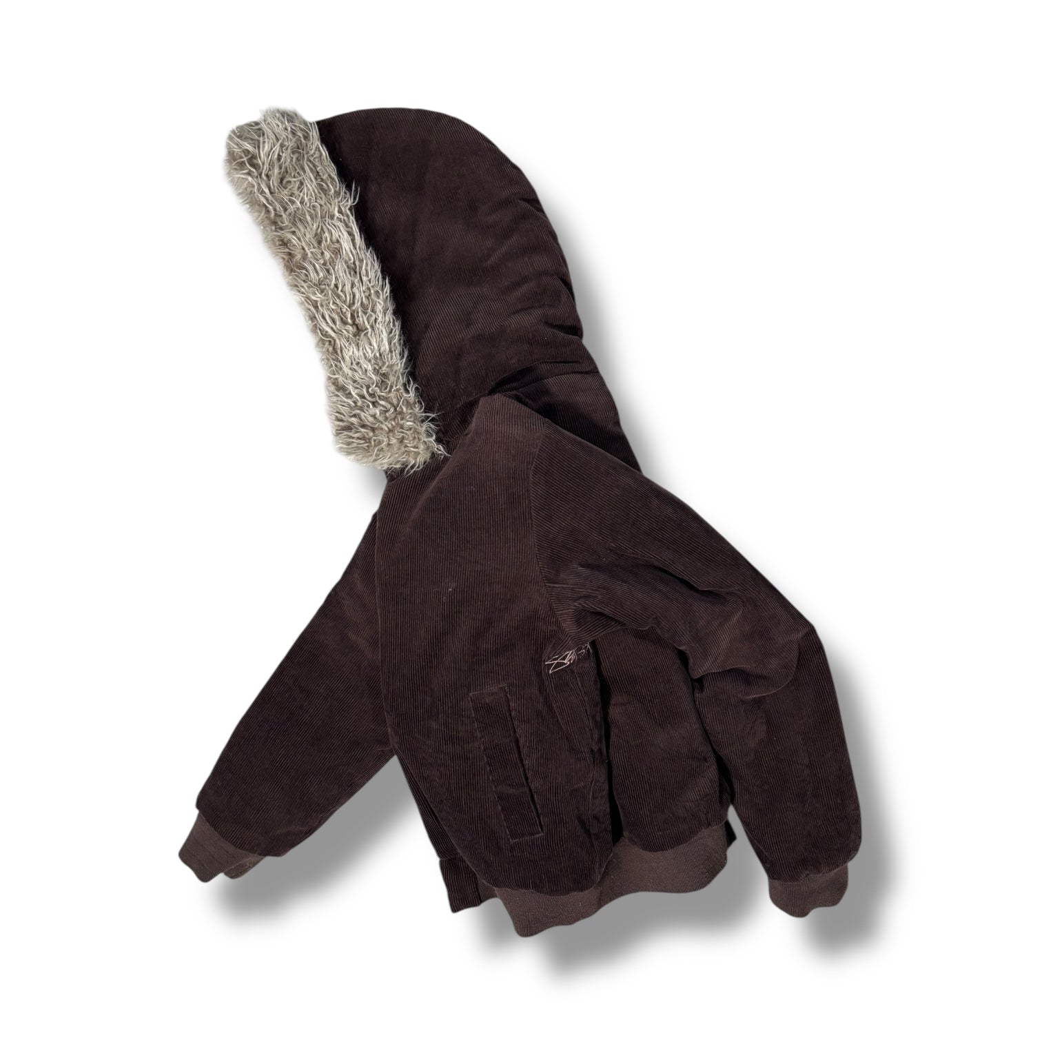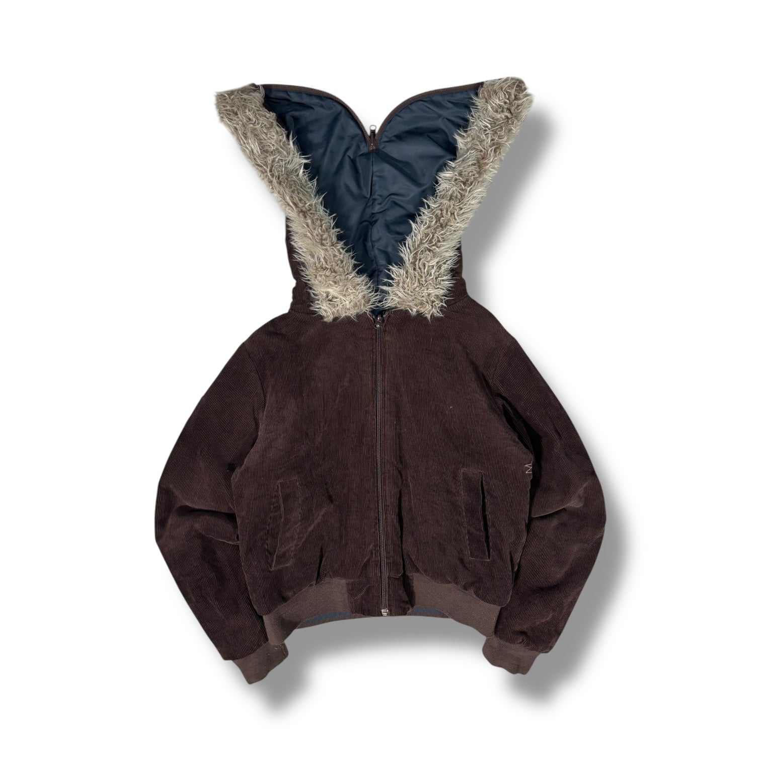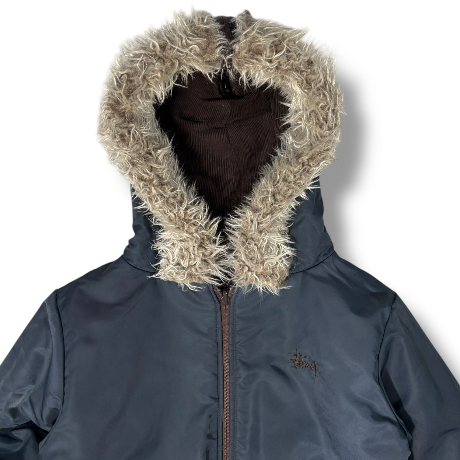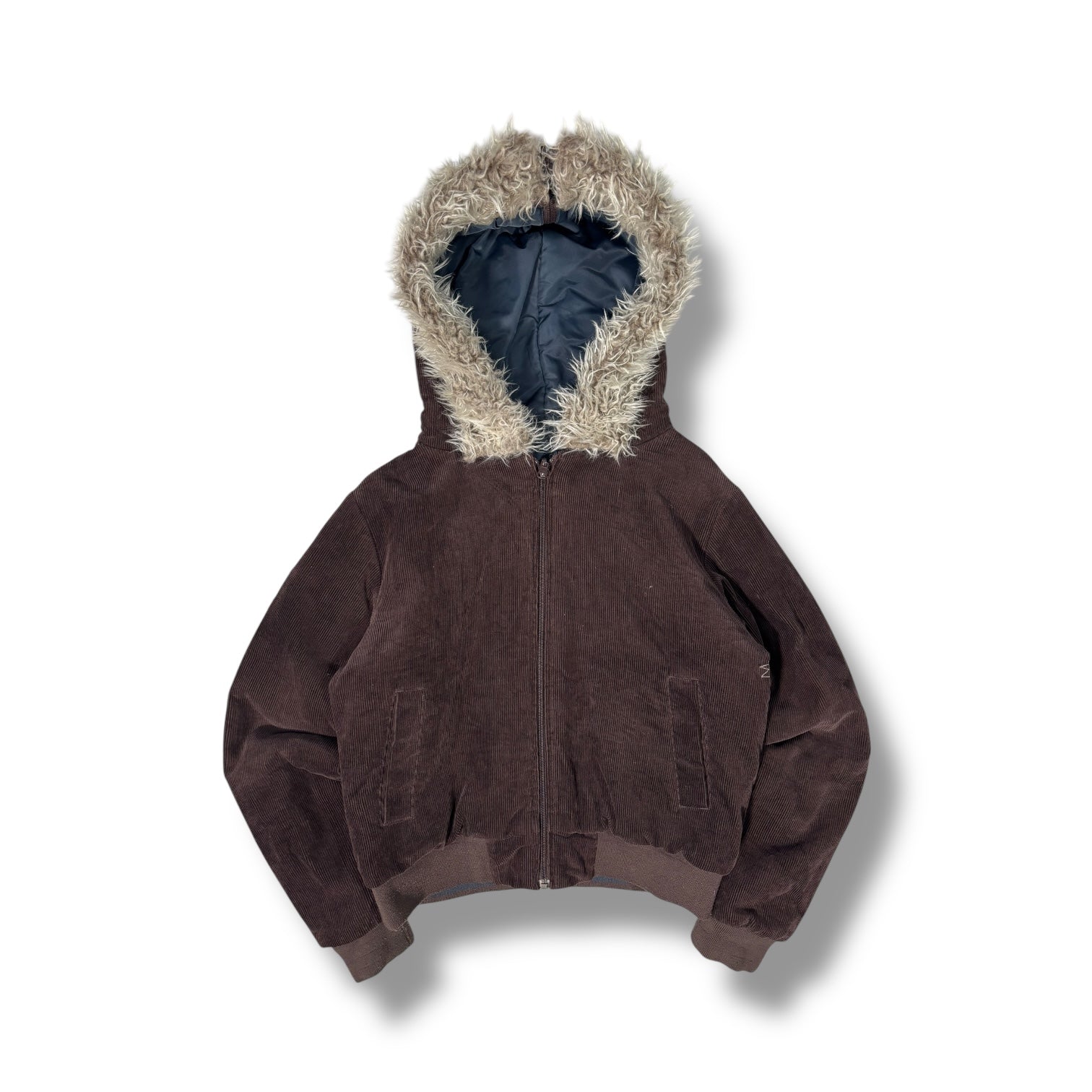 Dark brown and navy colourway with a fully reversible design. One side features a dark brown corduroy construction with tonal hand pockets, ribbed hem and cuffs, and a crest-style patch on the sleeve. The reverse side is constructed in navy with matching hand pockets and tonal embroidery at the chest. Both sides include a hood lined with beige faux fur and a zip closure running through the center.