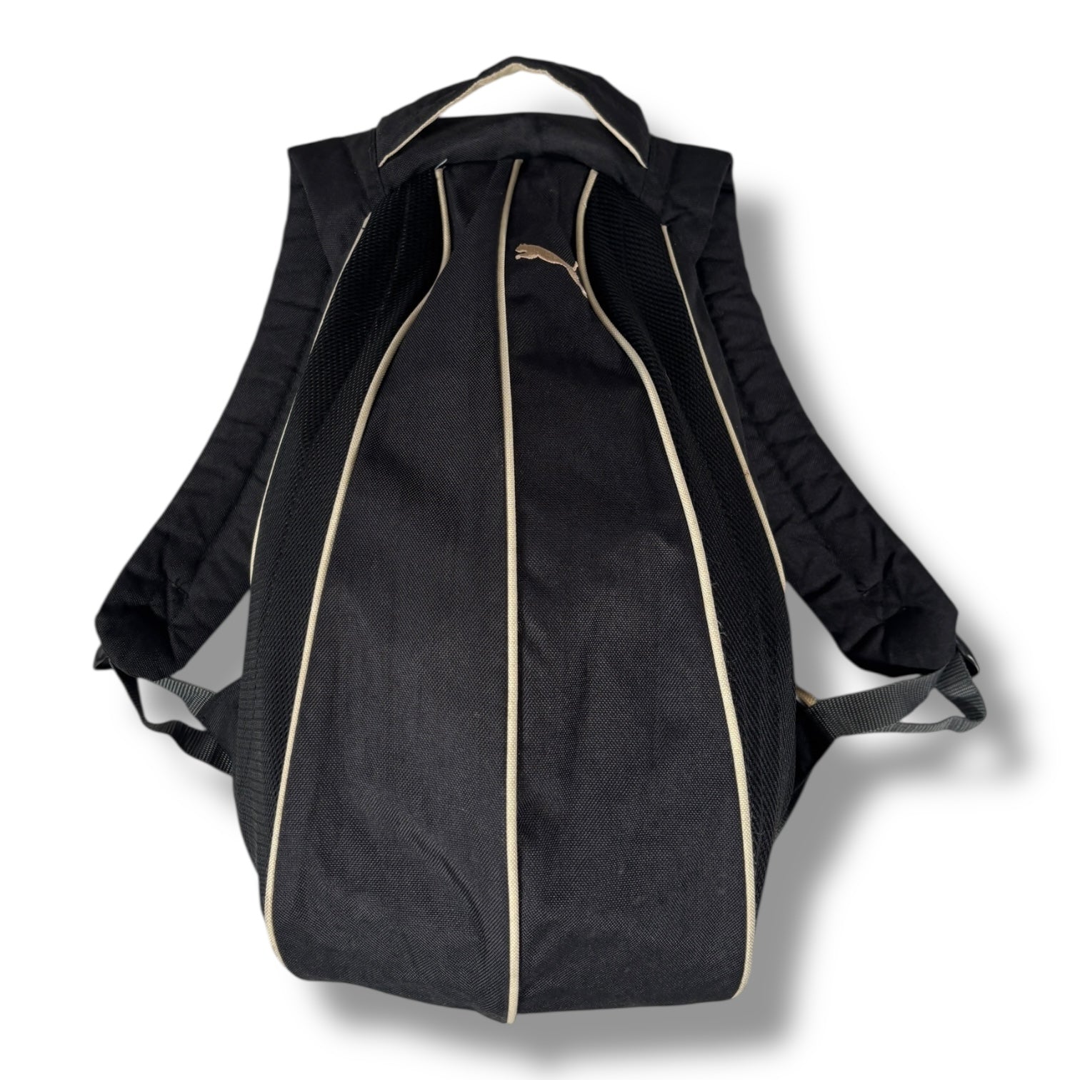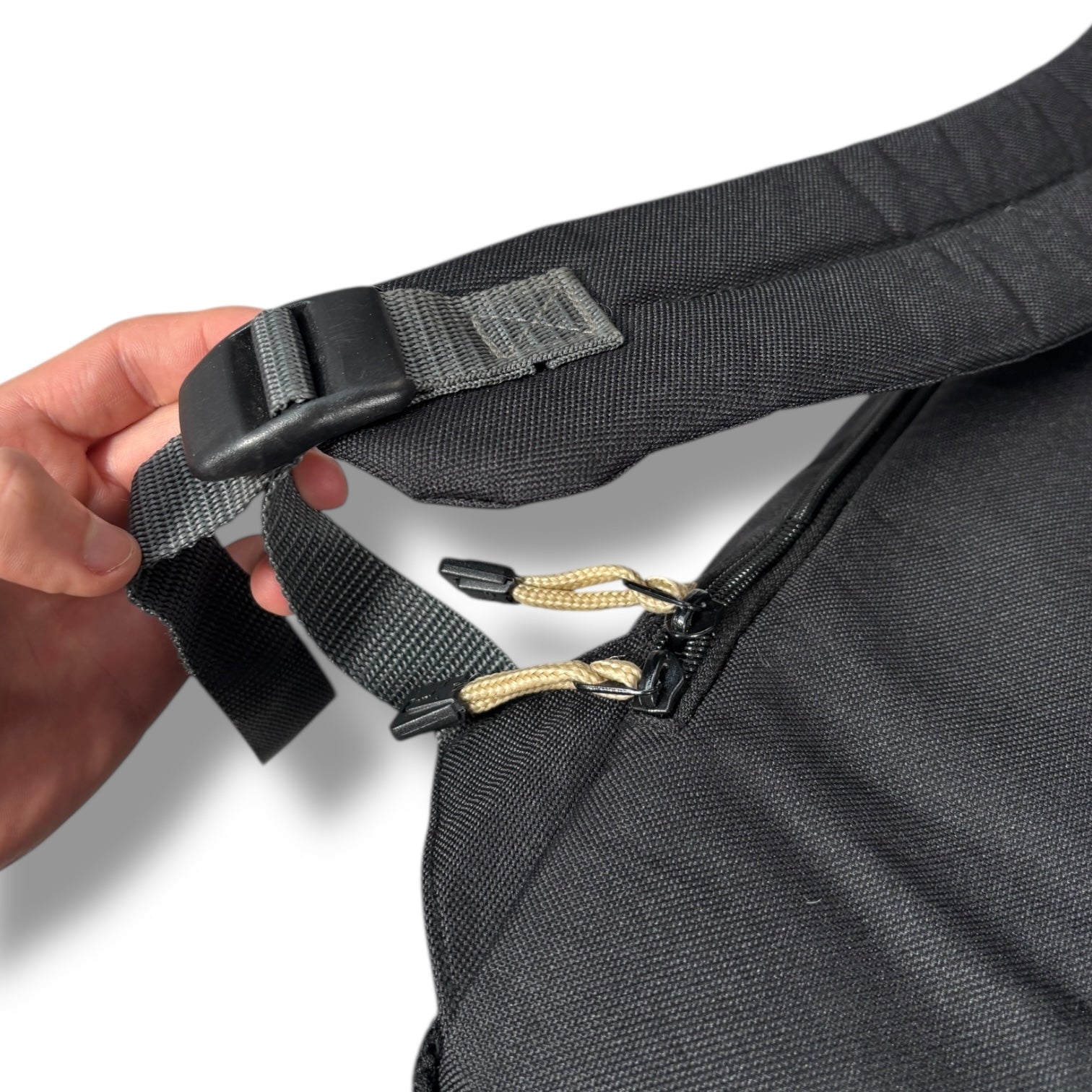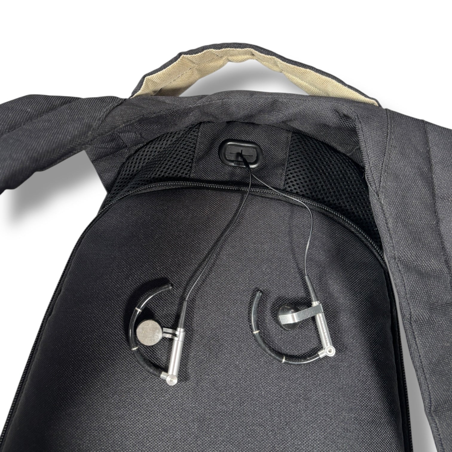 Black colourway featuring a teardrop-shaped body with contrasting beige piping along the back panel and shoulder straps. The front panel includes a central zip compartment with beige pull cords, and the interior features a padded section secured by a velcro strap. Additional internal slots hold small accessories, while a built-in headphone port is located at the top rear. Mesh padding lines the back and sides, and adjustable straps are secured with black buckles.